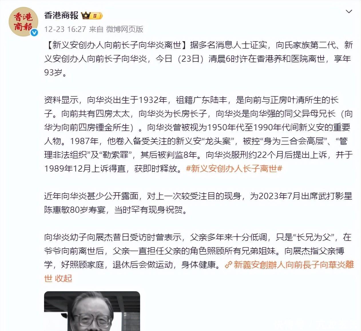 结语向华炎的一生,其实是一个巨大的矛盾体,他有着书生的底色,却执掌了半生的社团,他身处复杂的江湖,却培养出了深耕法治领域的儿子,他是弟弟向华强最坚实的后盾,却也是让他最敬畏的权威。向华炎并不是那个喜欢打打杀杀的狠人,他是被时代洪流裹挟着,不得不硬着头皮为家族撑起一把伞的守夜人。如今,伞收了,夜深了,养和医院的早晨很冷,对于向家,对于香港那个已经远去的江湖来说,这一天,是一个句号。至于向家后人能不能守住这份家业,又或者在新的时代里换一种活法,那是另一个故事了。