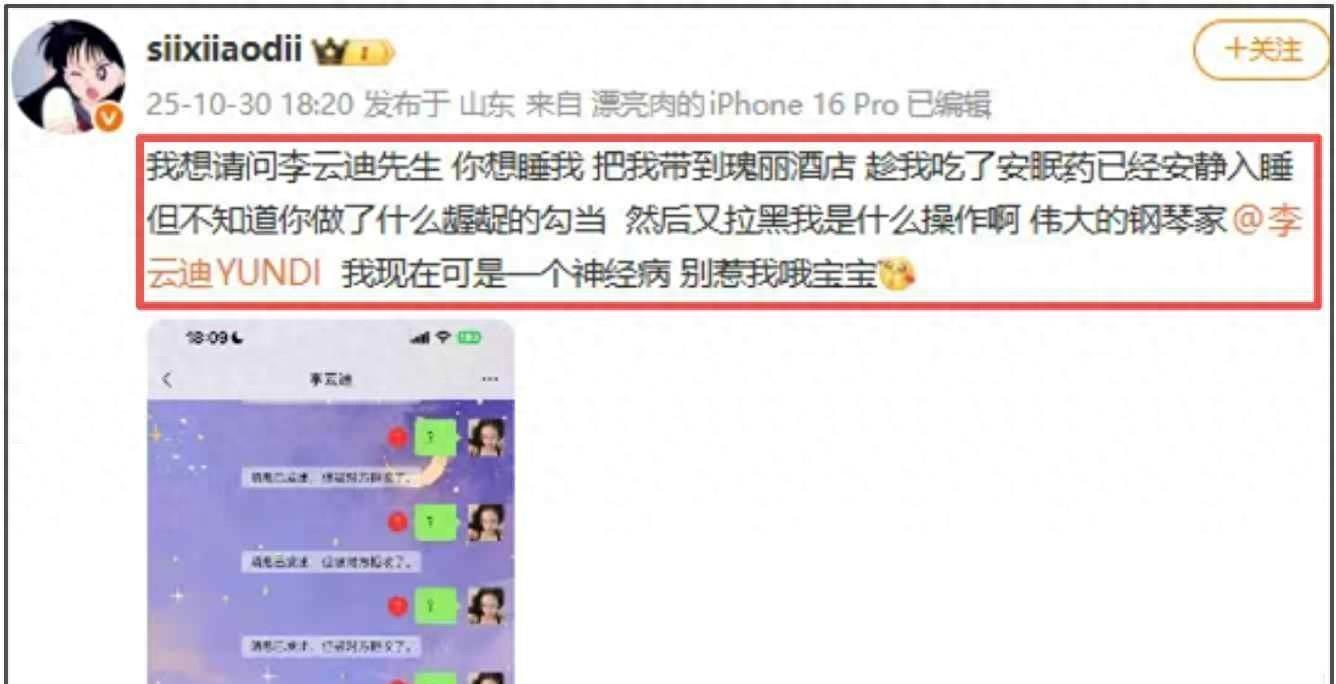 10号晚上,司晓迪在微博发了一条内容,说李云迪趁她吃药后没力气的时候做了不该做的事,之后还把她拉黑了,她话说得很冲,说自己现在跟疯了一样,别招她,这条微博很快被删了,但她又补了一句,我真的很讨厌李云迪了,这事一出来,网上立马就吵开了,李云迪那边到目前为止一个字都没回。